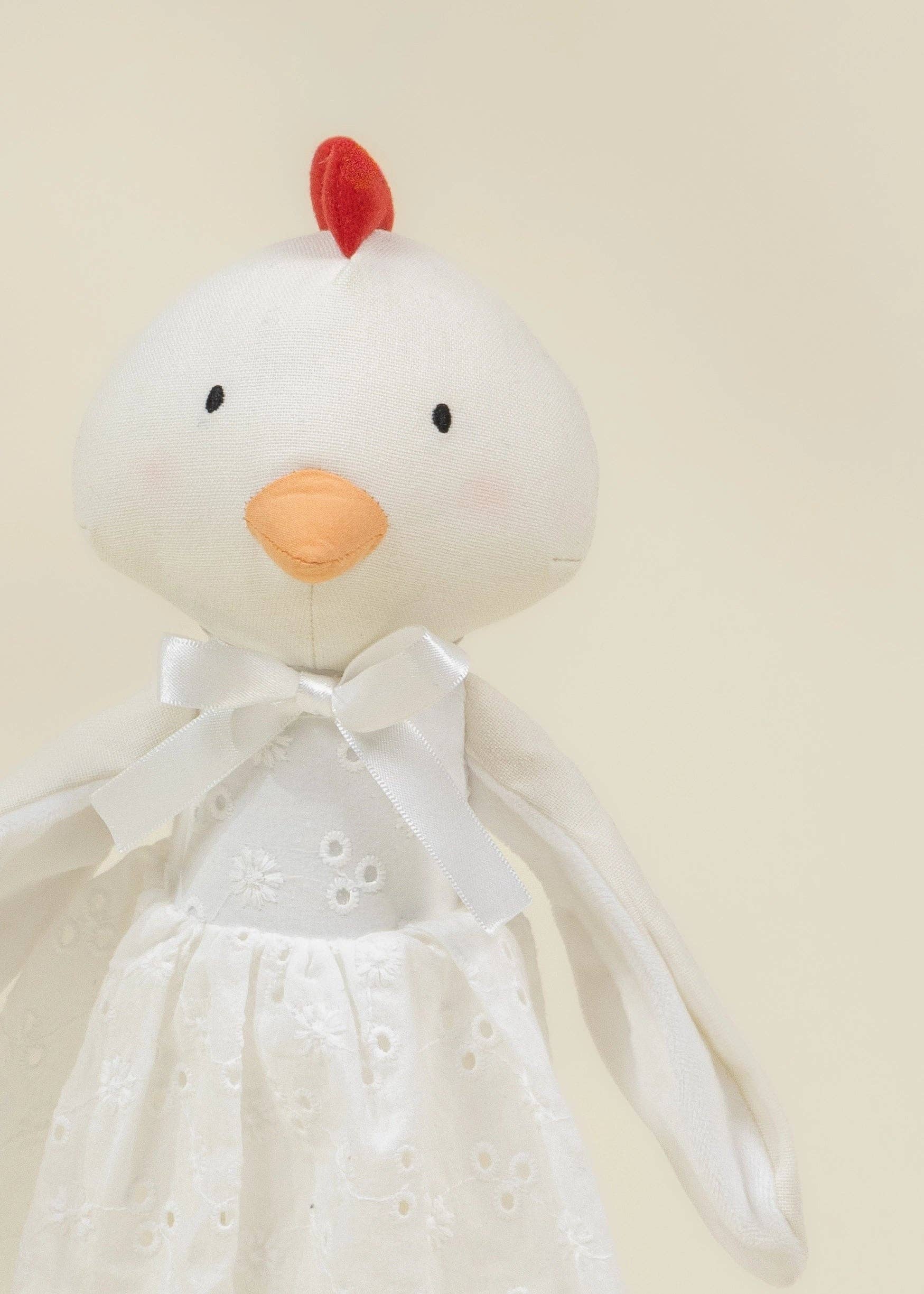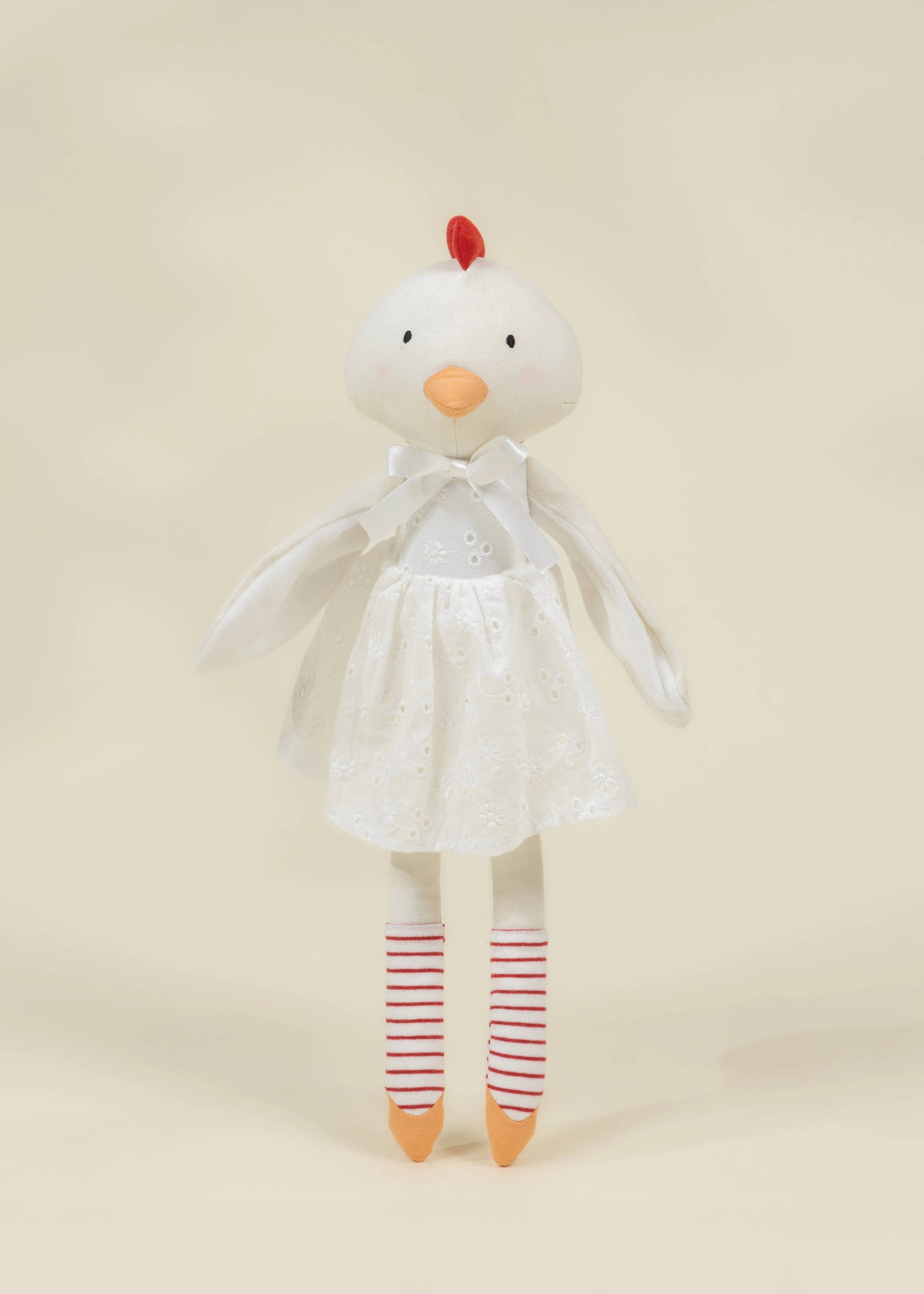 Meet this charming hen, dressed in a delicate white dress with embroidered eyelet details and playful striped stockings. With her sweet expression, soft wings, and bright little comb, she brings a storybook quality that sparks imaginative play and heartfelt adventures.
