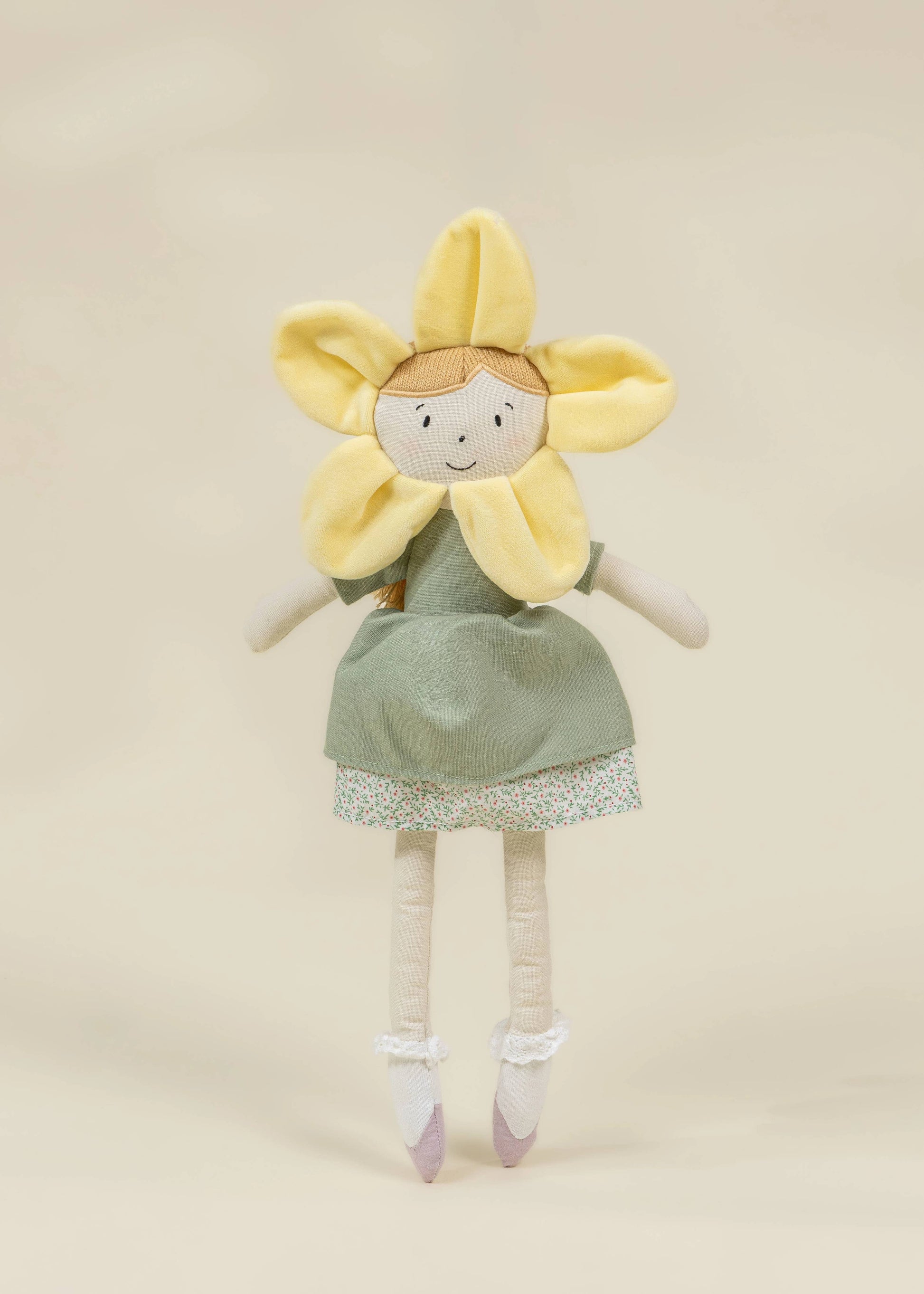 Meet this cheerful sunflower friend, dressed in a soft green dress with delicate details and petal-like headpiece framing a sweet embroidered face. With its gentle expression and playful silhouette, this charming companion is designed to spark imaginative play and bring a touch of sunshine to any space.