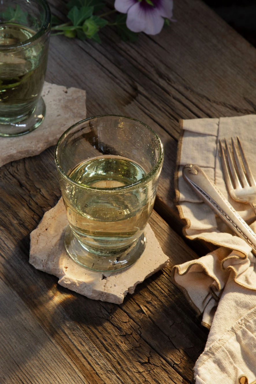 Softly luminous with a subtle green tint, this hand-blown glass brings an organic elegance to the table. Gentle ripples and tiny air bubbles catch the light, giving each piece a one-of-a-kind character that feels both rustic and refined. Perfect for water, wine, or a casual aperitif, it’s the kind of everyday glass that instantly elevates a simple meal.