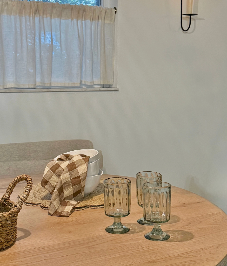 Timeless with a touch of charm, this hand-blown pedestal glass features a softly ribbed bowl and a sturdy, elevated base that feels both classic and approachable. Subtle variations in the glass and gentle imperfections highlight its artisanal craftsmanship, making each piece beautifully unique. Ideal for wine, water, or a simple spritz, it brings an effortless elegance to everyday tables and special gatherings alike.
