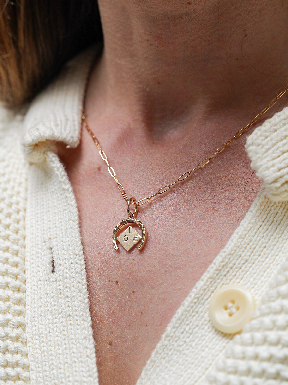 This super fun vintage spinner charm is shaped like a horseshoe with 7 nails, symbolizing good luck to the wearer. The center disc has enamel letters on each side "L V U" on one, "I O E " on the other, so when spun reads "I LOVE U". Constructed in 14 karat yellow gold from circa 1930s-1950s.