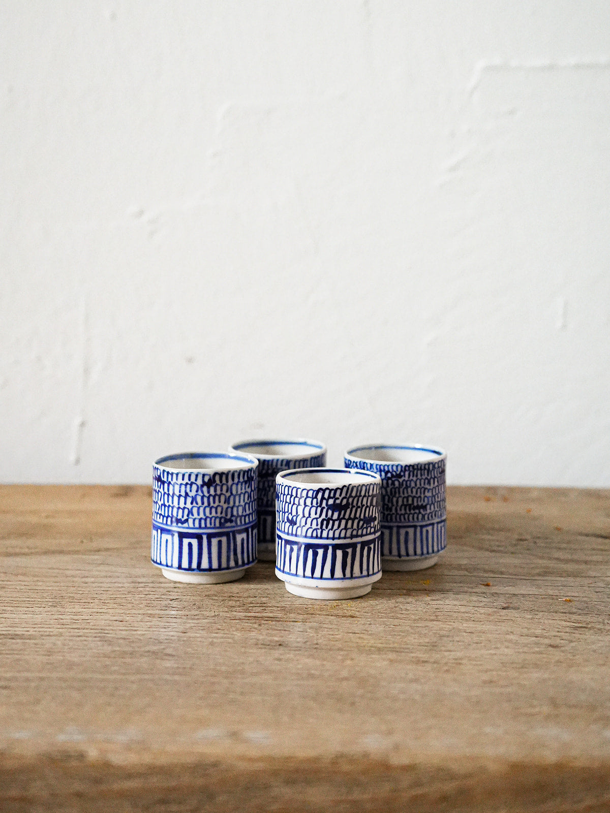 A beautiful set of four vintage Japanese sake cups, each hand-formed with subtle variations in tone and texture that speak to their artisanal nature. Their simple, tactile design captures the quiet elegance of traditional Japanese craftsmanship — refined yet unpretentious.